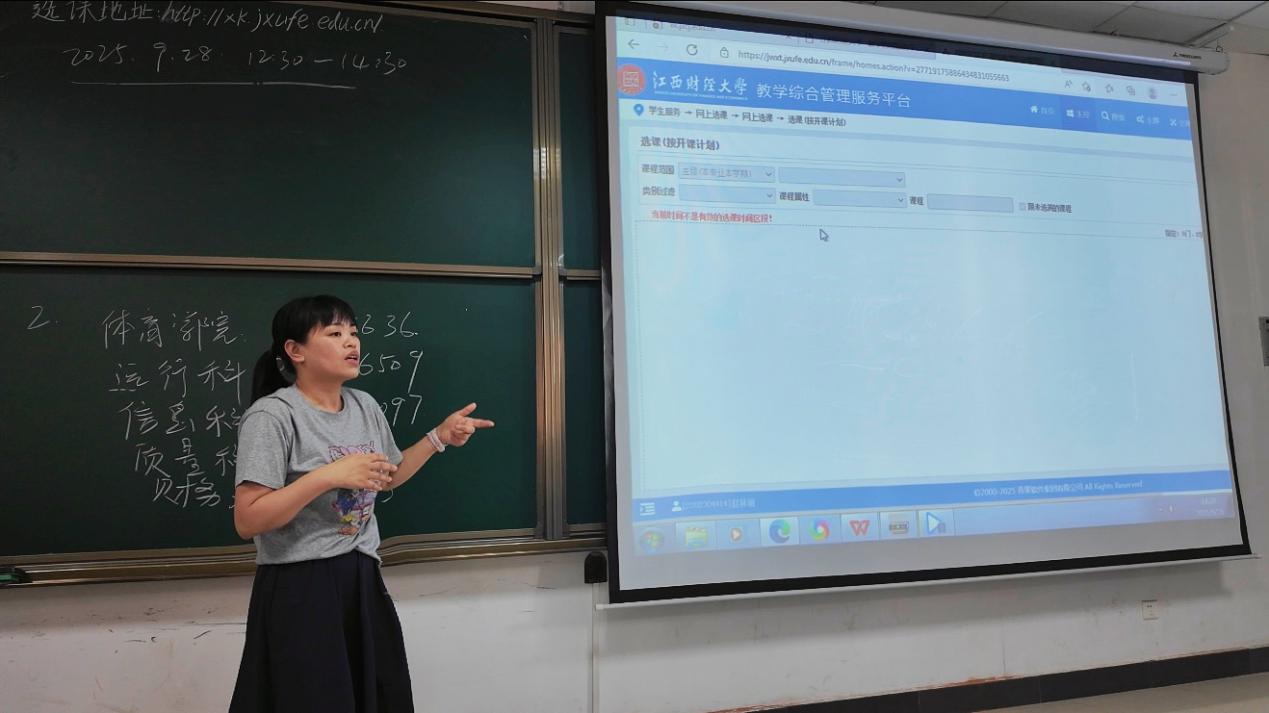 9月28日,学院党委副书记詹新寰以党的基础知识、校史校训、学业规划为核心,为新生带来“第一课”。他通过梳理小宝影院 的发展脉络,展示雄厚师资力量,以及社会体育指导与管理、运动训练等专业领域的亮眼成果,不仅让新生深刻领会学院精神传承,更激发了其对集体的归属感与专业自豪感,为新生锚定了“知校、爱校、荣校”的情感坐标。教学秘书王小英老师聚焦“学习服务保障”,开展《教育系统应用与选课指南》专题培训。她以“小宝影院 信息门户”操作为核心,细致拆解校园平台使用流程,结合实用选课策略,手把手帮助新生破解学习生活中的“技术难题”,确保新生能快速适应大学教学管理模式,为后续学业开展扫清障碍。