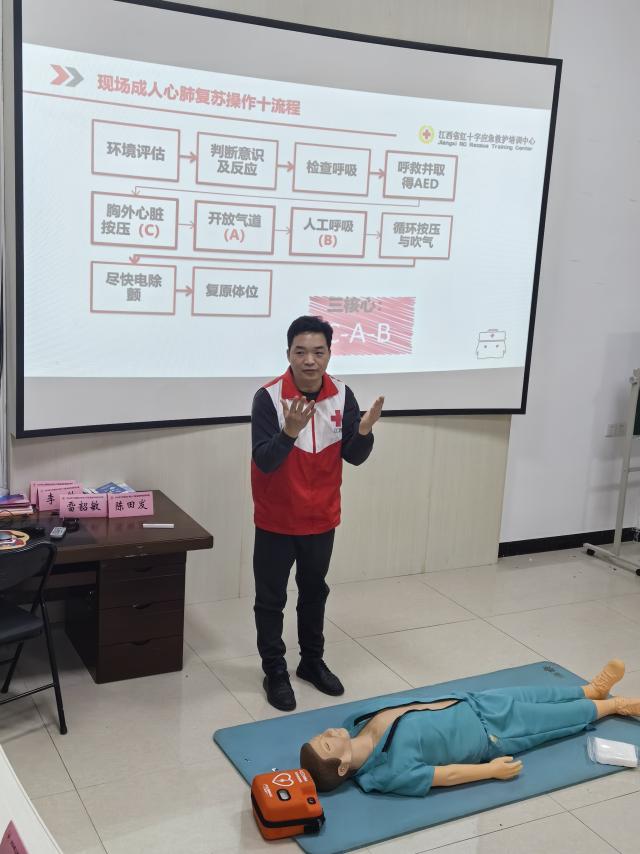 The teachers of the Jiangxi Provincial Red Cross Emergency Ambulance Training Center taught the trainees the new concept of ambulance, cardiopulmonary resuscitation, hemostasis bandaging, accidental injury and other related knowledge and skills and the concept of caring for life through theoretical explanations, practical exercises, group exercises andobservation.
